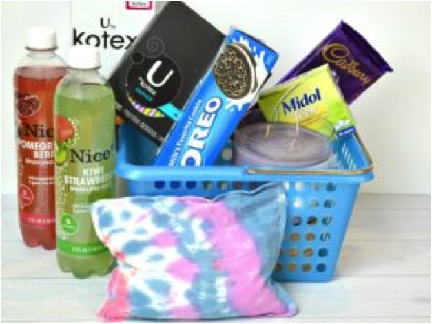 Compre o prepare una linda canasta y llévela llena de cosas para niñas tales como: un sostén nuevo, toallas sanitarias regulares, pastillas para el dolor en adolescentes, jabón para el cuerpo, libros, chocolate, parches térmico para el dolor menstrual y una carta dandole la bienvenida a la feminidad.